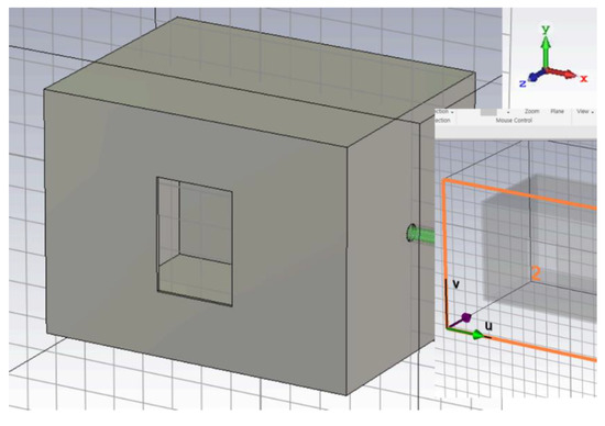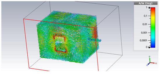 Figure 14) show the shape of the cavity, the arrangement of the antennas, and the current distribution when the IEMI is incident from the front.