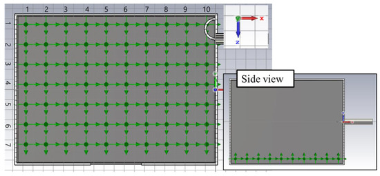 For effective internal field cancellation, the feeder should be installed where the surface current is most dense. The equipment is usually installed at the bottom of the protection facilities. Thus, the field is observed by installing sensors on the bottom of the cavity. A total of 70 probes were installed, i.e., 10 horizontally and 7 vertically, each 20 mm apart, 8 mm from the bottom. The figures below (