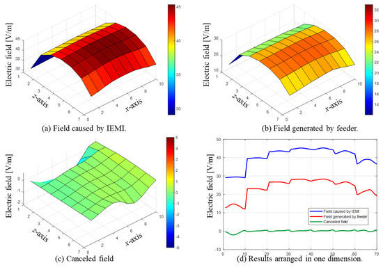 Figure 16a shows the result of plotting the field on the bottom at a specific frequency by post-processing the result. In the same situation, the feeder generates an estimated canceling signal using a real-time reduction technique. The result of plotting this signal in the same position as before is also shown in