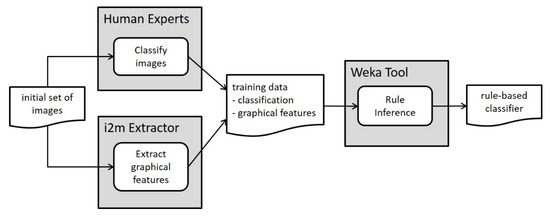 More specifically, our hypothesis is that an automatic rule-based classifier obtained through machine learning algorithms can emulate the experts’ classification of images as static UML diagrams. The method we have followed can be roughly described as follows. First, we obtained a sample of nearly 19,000 images from the web (exactly 18,899 items) that resulted from queries in Google Images involving the terms “uml diagram”; then a team of experts manually classified the images as UML static diagrams (Yes/No). The reader is referred to our previous conference paper [9] for the details regarding the criteria followed in this manual classification. Second, we analyzed the main graphical characteristics of images that represent diagrams, such as grayscale histogram, color histogram, elementary geometric forms detected with image recognition techniques (especially rectangles), and so on. Third, using machine learning techniques (rule induction), we selected a combination of characteristics that maximize the effectiveness of the automatic classification. Fourth, we implemented the rules in a tool that is freely available for the public and that can be used to classify new images. The rest of this article explains these steps in detail.
