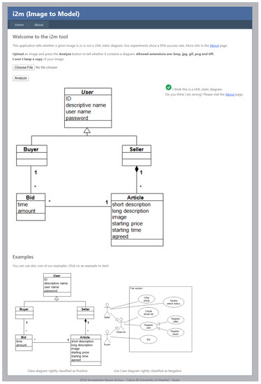 We developed the experimental i2m (image-to-model) tool according to the principles exposed in this research (see Figure 14). The current version of the tool (i2m v1.0, image-to-model tool: http://i2m.kr.inf.uc3m.es) accepts a bitmap file (in different formats) as the input and deduces whether the image corresponds to a UML static diagram in less than 1 s. More precisely, according to the data of four years working, the average time to extract the graphical features is 715 milliseconds, whilst the time to automatically classify the image is only a few milliseconds, which is negligible by comparison. The tool is freely accessible on the web.