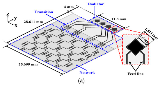 Figure 2 shows the configuration of the proposed antenna array system. The antenna array system is fabricated on a three-layer Taconic TLY substrate with a relative permittivity of 2.2, a loss tangent of 0.0009, and a thickness of 0.254 mm. The proposed antenna array system mainly consists of three parts, which include an 8 × 8 Butler matrix, a transition, and a stacked patch antenna array.
