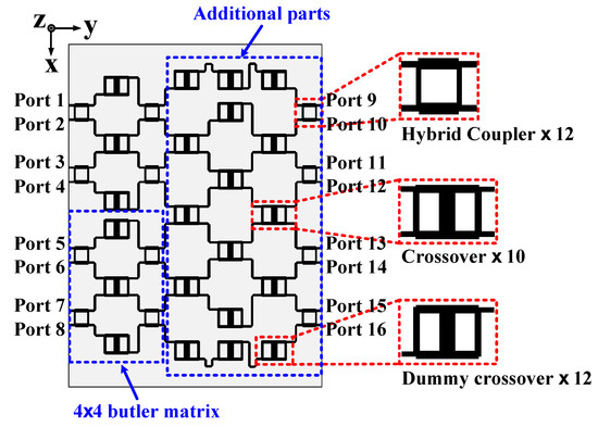 The structure of the 8 × 8 Butler matrix is shown in Figure 3. The 8 × 8 Butler matrix, which is based on the design scheme suggested in [3], consists of two 4 × 4 Butler matrices and additional parts to obtain the desired output phase distribution, as listed in Table 1. Each Butler matrix and the additional parts consist of stripline-based quadrature hybrid couplers, crossovers, and phase-balancing dummy crossovers. The line width of the striplines in the Butler matrix design are set to 0.17 mm to obtain a 50 Ω characteristic impedance.