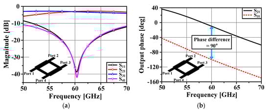Figure 4. Simulated S-parameters of the quadrature hybrid coupler: (a) amplitude and (b) output phase.