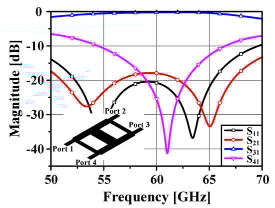 The crossover is formed by cascading two quadrature hybrid couplers. Figure 5 shows the simulated S-parameters of the crossover when port 1 is excited. It can be seen that the return loss (S11) and isolation (S21 & S41) are lower than −15 dB over the frequency range of 57.41 GHz–64.12 GHz. The insertion loss (S31) is calculated as −0.25 dB at 60 GHz. These results coincide with the theoretical scattering matrix, as follows.