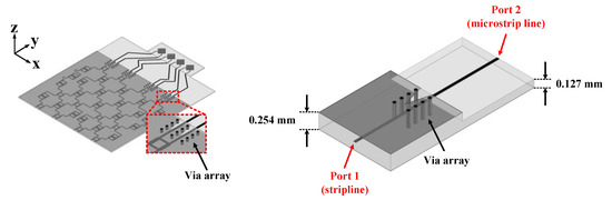 The configuration of the transition part to connect to the stripline-type Butler matrix with the microstrip patch antenna array is illustrated in Figure 7. The 0.17 mm widths of the stripline and microstrip line are chosen to be the same. The stripline and microstrip line share the bottom ground. The top ground of the stripline is cut out into a triangular shape at the interface between the stripline and microstrip line to obtain a good impedance matching. The series via array is also added for proper impedance matching. The radius of each via is 0.1 mm and the via array spacing is 0.5 mm. Figure 8a shows the comparison between the simulated transmission coefficients (S21s) of the designed transition part with and without the via array. For the case with a series via array, unlike the case without a series via array, it can be seen that there are no resonances and large ripples on the S21 curves over the frequency range of 50 GHz–70 GHz. The calculated characteristic impedances of the stripline and microstrip line are 50 Ω and 73 Ω, respectively, as shown in Figure 8b.