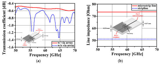 Figure 8. Simulated results of the transition part: (a) transmission coefficient with and without series via array and (b) line impedance.