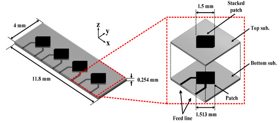 Figure 9 shows the geometry of the designed 1 × 4 patch antenna array. The proposed antenna array has four inset-fed stacked patch antenna elements with wideband characteristics. The antenna elements are designed on two stacked substrates with three layers. Each substrate has a thickness of 0.127 mm. The ground plane of the designed antenna element is on the bottom layer and the square patch and the parasitic stacked patch are positioned on the mid layer and top layer, respectively. The optimized lengths of each square patch and parasitic stacked patch are obtained as 1.513 mm and 1.5 mm, respectively. The simulated reflection coefficients for the various lengths of the parasitic stacked patch are shown in Figure 10a. The characteristic impedance of the antenna is set as 73 Ω to integrate with the designed Butler matrix. Each antenna element has two feed lines to generate the circularly polarized radiation pattern. The edges of the parasitic stacked patches are slightly cut to further guarantee that the radiation has a circular polarization. The distance between the two adjacent elements in the designed array is 2.6 mm, which is about a half-wavelength at 60 GHz. Figure 10b shows the simulated gain pattern of the 1 × 4 patch antenna array in the xz-plane at 60 GHz with the same phase and amplitude excitation.