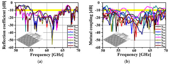 Figure 11. Simulated results of the proposed antenna array system: (a) reflection coefficient and (b) mutual coupling.