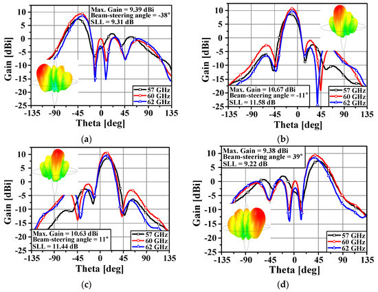 Figure 12 shows the simulated gain patterns in the xz-plane and the three-dimensional radiation patterns at 60 GHz of the proposed antenna array system when ports 2, 4, 5, and 7 are excited. At 60 GHz, the maximum gains are 9.39 dBi, 10.67 dBi, 10.63 dBi, and 9.38 dBi when the input ports 2, 4, 5, and 7 are excited, respectively. The beam-steering angles are −38°, −11°, +11°, and +39°, respectively. At 57 GHz, the maximum gains and beam-steering angles for ports 2, 4, 5, and 7 are 7.51 dBi at −44°, 9.37 dBi at −14°, 9.33 dBi at +14°, and 7.45 dBi at +45°, respectively. At 62 GHz, the maximum gains and beam-steering angles for ports 2, 4, 5, and 7 are 8.61 dBi at −37°, 10.01 dBi at −11°, 9.87 dBi at +11°, and 8.53 dBi at +37°, respectively.