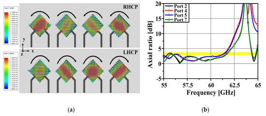 Figure 13a shows the simulated surface current distributions of the patch antenna array. It can be seen that the circularly rotating surface currents are formed on the patch conductors by the ±90° phase difference between two inputs of the designed dual-fed patch antenna. The RHCP is formed when four ports from port 1 to port 4 are excited and LHCP is formed when four ports from port 5 to port 8 are excited. The simulated axial ratios of the proposed antenna array system for the excitation of ports 2, 4, 5, and 7 of the Butler matrix are shown in Figure 13b. The axial ratios are less than 3 dB over the frequency range of 54.9 GHz–61.5 GHz. The operating modes of the proposed antenna array system for selecting each input port are listed in Table 2.