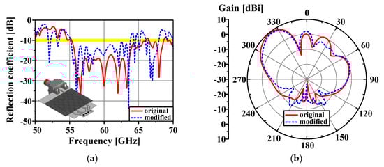 Figure 15. Comparison of the simulated results between the original model and modified model: (a) reflection coefficient for port 2 model, (b) radiation pattern for port 2 model, (c) reflection coefficient for port 4 model, and (d) radiation pattern for port 4 model.
