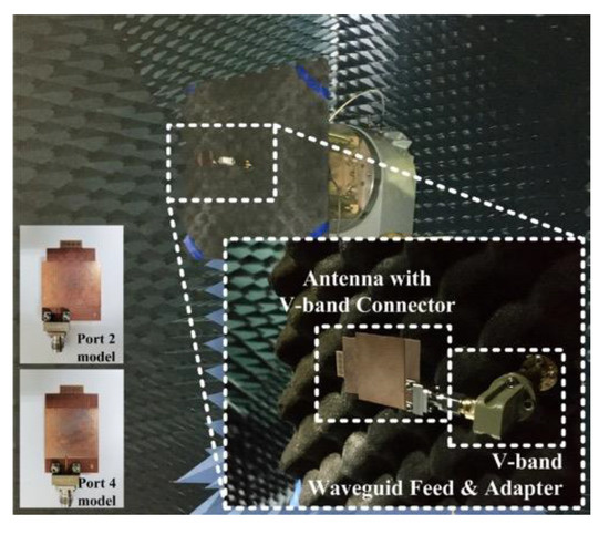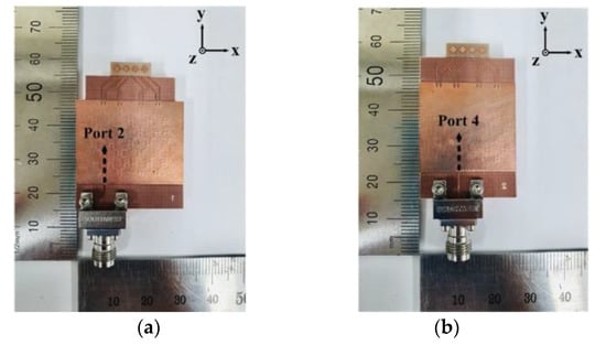 Figure 16 shows the fabricated prototypes of the antenna with connector for port 2 and port 4. Figure 17 shows a photograph of the fabricated antenna and measurement setup. The fabricated antenna with a V-band connector is connected to a waveguide-to-coax adapter and a waveguide feed.