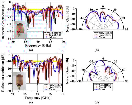 Figure 18. Measured results of reflection coefficient and radiation pattern: (a) reflection coefficient for port 2 model, (b) radiation pattern for port 2 model, (c) reflection coefficient for port 4 model, and (d) radiation pattern for port 4 model.