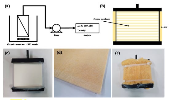 The removal efficiency of the system was evaluated on prepared samples containing heavy metals and turbidity. First, the ceramic membrane was used to confirm the removal of As(V), Zn(II), and turbidity according to solution pH. Heavy metal contaminants As(V) and Zn(II) were prepared at initial concentrations of 50 mg/L, and 2 g/L kaolin was used to create turbidity []. The pH values in the experimental solutions were adjusted to 2, 4, 6, and 8 using HCl and NaOH. The removal experiments were carried out with an internal submerged dead-end flow regime membrane system at a flow rate of 10 mL/min using a peristaltic pump (BT100-2J, Longer, China), and the change in pollutant concentration of the solution passed through the ceramic membrane was analyzed.
