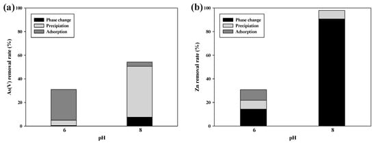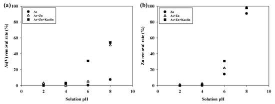 The removal rates of As(V) and Zn(II) by the ceramic membrane were investigated under various pH conditions (Figure 2). When only As(V) was present in the solution, its removal at solution pH values of 2, 4, and 6 was negligible. Only 7% of As(V) was removed by the ceramic membrane in solution pH 8. Meanwhile, the As(V) removal rate was increased to 50% at solution pH 8 in a solution containing As(V) and Zn(II) (As + Zn). This is due to the precipitation of As(V) with Zn(II) and/or adsorption of As(V) on the zinc hydroxide carbonate precipitate [,]. In a solution containing metal ions and turbidity (As + Zn + Kaolin), the removal rate of As(V) increased to 31% at solution pH 6 and reached 54% at solution pH 8. Here, the geochemical modeling with Visual Minteq 3.1 suggests that adsorption was the predominant reaction of As(V) removal at pH 6 whereas precipitation was the main mechanism at pH 8 (Figure 3a). The saturation index (Table 1) calculated using Visual Minteq 3.1 confirms that Zn3(AsO4)2·2.5H2O(s) was the main species of As(V) precipitate at solution pH 8. The positive values of the saturation index indicate the supersaturated condition due to the formation of a particular product [,].