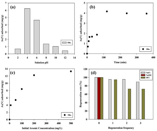 The adsorption capacity of an IEF can generally be regenerated using NaCl, NaOH, and HCl, with the regeneration rate depending on the solution conditions and ion-exchanger properties []. As shown in Figure 4d, the regeneration rate with 0.1 M NaCl solution averaged around 95% and decreased slightly as the number of regenerations was increased. The regeneration rate with 0.1 M HCl solution was similar to NaCl (94%) during the first regeneration cycle but decreased significantly compared to NaCl, with an increase in the number of regeneration cycles. On the other hand, the NaOH solution was not able to regenerate the As(V) adsorption capacity of the IEF at all.