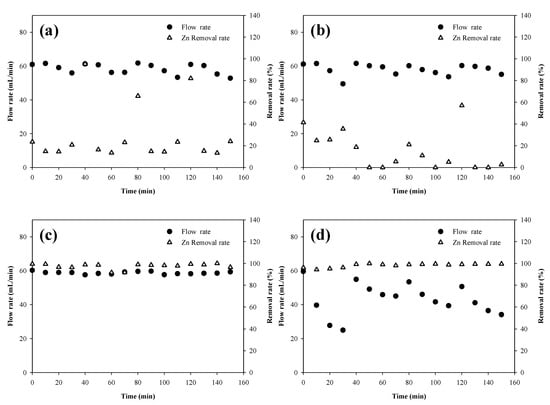 Effect of solution pH on the flow rate and Zn and As removal rates during the hybrid ion-exchange fabric/ceramic membrane processing of As + Zn + Kaolin solution: (a) pH 4, (b) pH 6, (c) pH 8, and (d) pH 10.