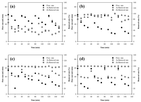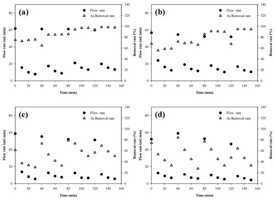 Effect of solution pH on the flow rate and As removal rate during the hybrid ion-exchange fabric/ceramic membrane processing of the As + Kaolin solution: (a) pH 4, (b) pH 6, (c) pH 8, and (d) pH 10.