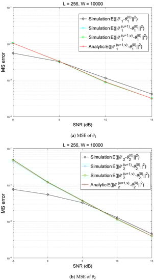 Analytic and simulated MSEs (Mean Square Errors) of and with respect to SNR (Signal to Noise Ratio).