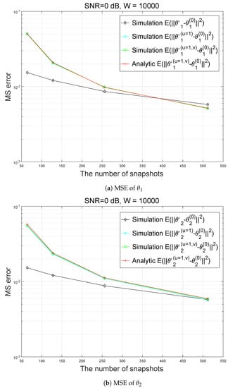 In Figure 1, Figure 2, Figure 3 and Figure 4, we illustrate the accuracy of estimation of azimuths. In the simulation, an additive noise is assumed to be zero-mean Gaussian-distributed. In Figure 1, Figure 2, Figure 3 and Figure 4, the results with ‘Simulation ’, ‘Simulation ’, ‘Simulation ’, and ‘Analytic ’ are obtained from (39), (40), (41), and (36), respectively.
