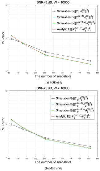Analytic and simulated MSEs and with respect to the number of snapshots (SNR = 5 dB).