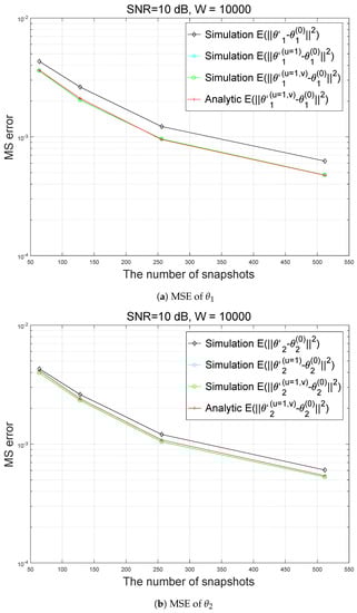 The number of incident signals is two, where two signals are incident from and . The number of antenna elements is 10, and the number of snapshots is 1000. In getting the Monte Carlo simulation-based MSE, since the computational complexity is nearly proportional to the number of repetitions, the number of repetitions varies from 100 to 1000 in increments of 100.
