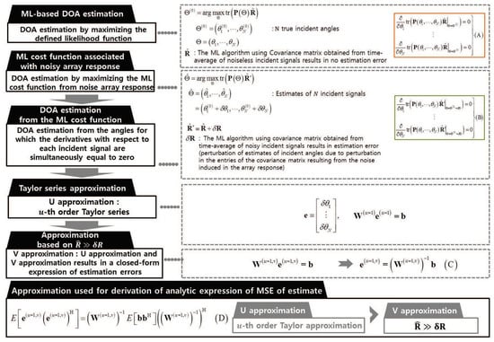To quantify the estimation error due to an additive noise, equations (A) and (B) and two approximations of U approximation and V approximation are used. Note that the covariance matrix in equation (A) and that in equation (B) are associated with noiseless response and noisy response, respectively. Applying the Taylor series approximation in equation (B) and using equation (A) in the approximated expression, the azimuth estimation error in equation (C) can be derived. To get an explicit expression of the MSE of the azimuth estimate, V approximation is applied, and the closed-form expression of the MSE of the estimate is obtained from equation (D).