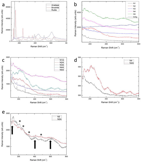 Raman spectra at room temperature for different systems: (a) anatase, rutile and brookite synthetic powders; (b) samples N1-N5 and the background signal for N5 sample; (c) CP-treated samples N1A-N5A. In panels (d) and (e) a comparison between untreated and CP-treated samples is reported respectively for N4 and N5 samples. The arrows in Figure 1e indicate the TiO2 Raman bands while the asterisks indicate the main ripple structures.