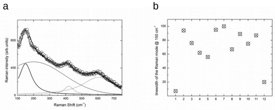 (a) Raman spectrum at room temperature for N5 sample (open circle) and the result from the best-fitting procedure (solid line). The single components used to obtain the best-fitting curve are also reported [see text]. (b) The values of the linewidth for the Eg mode at around 150 cm-1, derived from the results of the best-fitting analyses from ten Raman spectra (point 2–point 11). The first and the latter are the typical values obtained from a single crystal anatase crystal and nanosized (10 nm) powders.