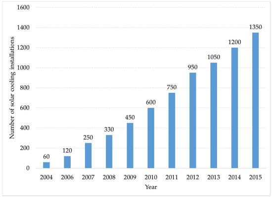 Number of solar cooling installations between 2004 and 2015. Reproduced with permission from [21], Copyright AIP Publishing, 2016.