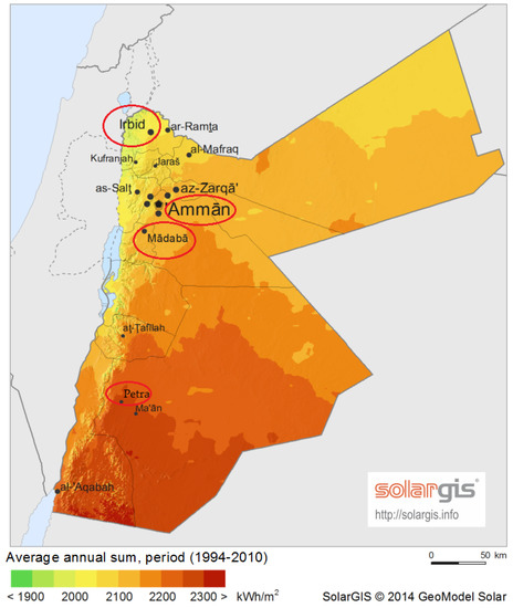 - Jordanian Ministry of Energy and Mineral Resources. Energy Annual Report in 2016; Amman, Jordan. Available online: https://www.greengrowthknowledge.org/sites/default/files/downloads/policy-database/JORDAN%29%20The%20Ministry%20of%20Energy%20and%20Mineral%20Resources%2C%20Annual%20Report%202016.pdf (accessed on 1 March 2020).