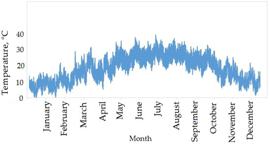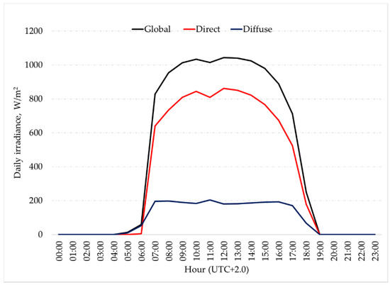 The air temperature data for year 2015 in Madaba is presented in Figure 3. Madaba has an inland climate with large air temperature fluctuations across the seasons. In typical summer months (May–September), the highest air temperature normally occurs in June and between 12:00 and 14:00 where the air dry bulb temperature could reach 40 °C. The solar radiation normally reaches its peak value of around 1030 W/m2 between 9:00 and 15:00, as shown in Figure 4.