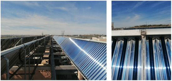 The solar heating and cooling system was installed on the rooftop of building C at the GJU campus. The solar heating system consists of 30 solar collector arrays each with five modules connected in series. Each module (model CPC1518) has 18 evacuated tube collectors with compound parabolic collector (CPC) geometry. The aperture total surface area of the solar field was 450 m2 and the collectors were oriented to face the south with a tilt angle of 45°. Figure 5 shows the solar collector field installed on the rooftop of Building C at the GJU campus.