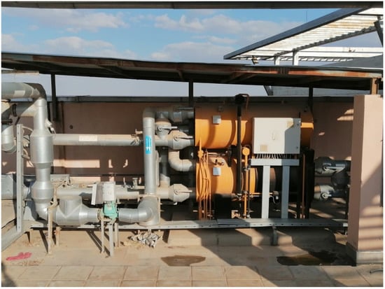 The measurement of the global solar irradiance on a horizontal surface is carried out by means of a pyranometer. The measurement of the ambient air is carried out by means of the sensor unit type ARFT/A-I/S. In addition, the measurement of the electrical energy consumption (in kWh) of the components necessary for the solar cooling application was taken. The measurement of the electrical energy of components is completed by means of the watt-hour meter type iEM3150. Figure 6 shows the 160 kW H2O-LiBr absorption chiller at GJU Building’s C roof.