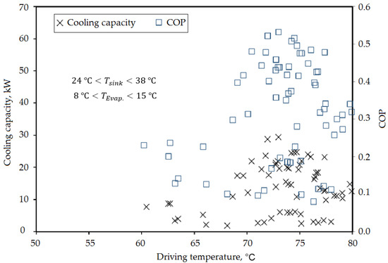 Cooling capacity and thermal Coefficient of Performance (COP) of the absorption chiller in GJU as a function of driving temperature, modified from [29].