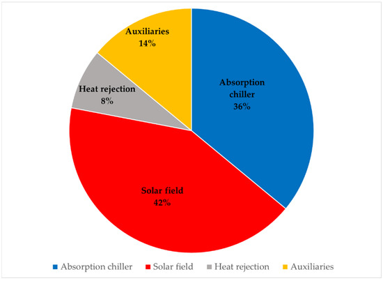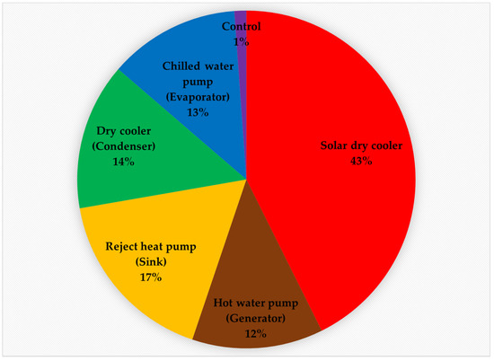 In order to determine the economic feasibility of the absorption chiller system, an estimation of the various components of the system was performed. A spreadsheet was tailored specifically to the absorption chiller system to perform the economic mathematical analysis. Various parameters were taken into account through the economic calculations. The system cost is defined through the cost of the absorption chiller according to the cooling capacity per watt, and the cost of the auxiliary component in the local market. Figure 8 shows the component share of the total cost.