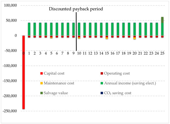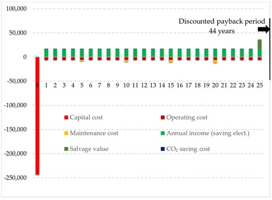 As shown in Figure 10, the absorption cooling system is deemed as feasible for a COP of 0.79 as claimed by the manufacturer over a lifespan of 25 years. The net present worth is equal to +185,070 JD and the payback period is equal to 10 years. However, the feasibility study of the absorption cooling system under real measurements over four summer months (May 2015–August 2015) with an average COP of 0.32 shows that the system is not feasible, as shown in Figure 11. For the observed cooling capacity, the net present value was equal to −137,684 JD with a payback period of 44 years which exceeds the expected lifespan of the project.