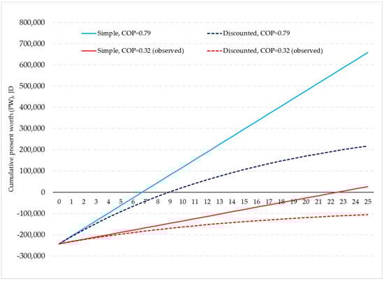 The simple (solid lines) and discounted (dashed lines) payback periods for the claimed COP = 0.79 (blue lines) and the observed COP = 0.32 (red lines) are shown graphically in Figure 12.