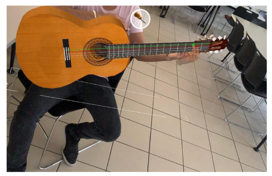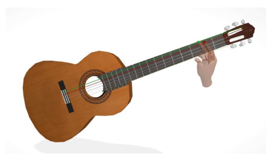 It is important to note that both students and teachers experience difficulties with the traditional Master–Apprentice model. Trainers need to design a teaching strategy that organizes time based on: student experience; face-to-face training; and periods of autonomous learning during which the student’s progress will very much depend on his or her own personal skill set [17]. In reviewing the main obstacles faced by students receiving musical training, it was found that students typically encounter two main problems: developing their musical ear [18], and understanding the instructional material used for learning (e.g., diagrams or drawings). In terms of the latter, AR can be used to address this challenge as it can be used to facilitate the visualisation of elements such as finger positioning [19]. A good example of this is the AR system proposed by Löchtefeld et al. [20], who designed and implemented an AR model that uses mobile projector mounted on the guitar’s headstock to project instructions that facilitate correct finger placement. Another recent proposal for learning the guitar suggests using coloured finger markers and then projecting the corresponding colours onto the strings and frets using AR to instruct learners how to perform a chord [21]. The aforementioned studies do not display hand movements involved in the chord transitions of short melodies.
