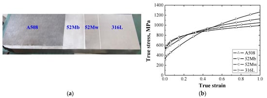 The structure of the DMWJ is shown in the Figure 2a [26]. There are four materials in this DMWJ: the ferrite low-alloy steel A508, the buttering material 52 Mb, the weld material 52 Mw, and the austenitic stainless steel 316 L. The true stress–strain curves of the four materials are shown in Figure 2b [8].