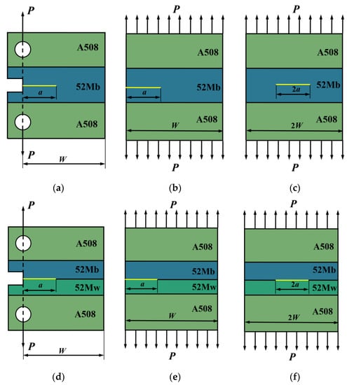Three sets of strength mismatched laboratory specimens (CT, SENT, and CCT specimens) with various specimen geometries, loading configurations, and initial cracks were selected in this study, as shown in the Figure 3. The SENB specimen has been investigated in the previous studies of authors [24,25].