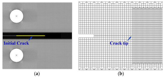 The typical finite element meshes of the CT-“121” model with a/W = 0.5 (a) and the local meshes in the crack growth region (b).