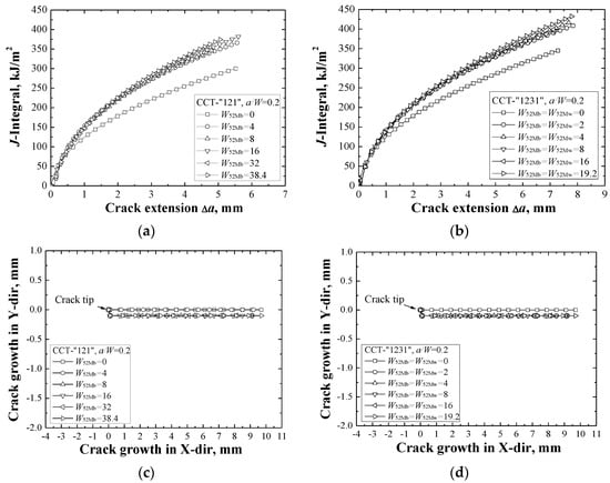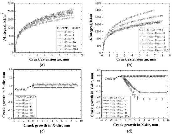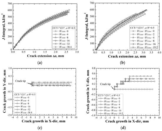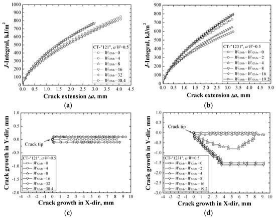 Figure 6 presents the fracture resistance curves and crack propagation paths of the CT-“121” and CT- “1231” specimens with deep crack under different material constraints. Figure 6a presents the fracture resistance curves of the CT-“121” specimens with deep crack.
