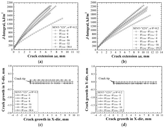 Figure 7 presents the fracture resistance curves and crack propagation paths of the SENT-“121” and SENT-“1231” specimens with shallow crack under different material constraints. Figure 7a,b presents that the fracture resistance curves of the SENT-“121” specimen and SENT-“1231” specimen show the same trends. It is related to the strengths of the materials A508, 52 Mb, and 52 Mw. Because the strengths of the materials 52 Mb and 52 Mw are higher than the material A508, the increasing of the widths of materials 52 Mb and 52 Mw increase the fracture resistances of specimens.