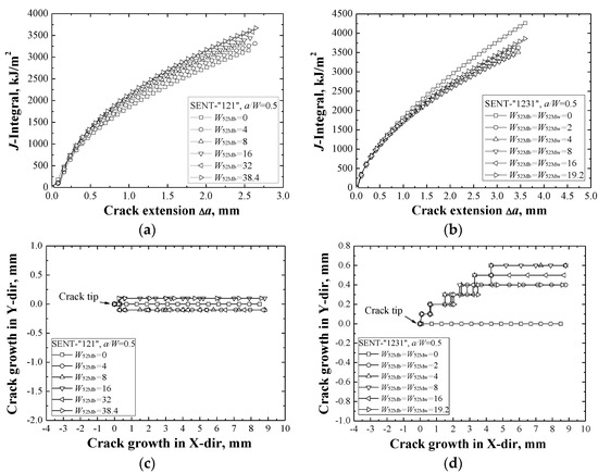 The fracture resistance curves of SENT-“121” (a) and SENT-“1231” (b) specimens with deep crack together with the crack propagation paths of SENT-“121” (c) and SENT-“1231” (d) specimens with deep crack.