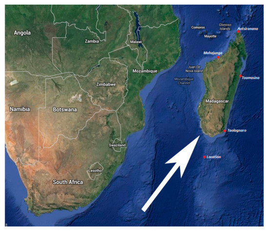 The Madagascar island is considered in terms of area and population to be the largest of the Indian Ocean islands, with an estimated area of 592,000 km2. It is dominated by the tropical climate, which is divided into two seasons: A rainy season from November to April and a dry season from May to October. In particular, Madagascar stretches between 20°0′ South latitude and 47°0′ East longitude, covering different climatic zones in which four of the cities studied are located. All these cities were selected due to being located in the coastal zone, with significant solar and wind power potential, as a consequence of their geographic location, which is very favorable for tourism and for their cultural diversity and micro-climate. The local position of each studied city in this research is shown in Figure 1.