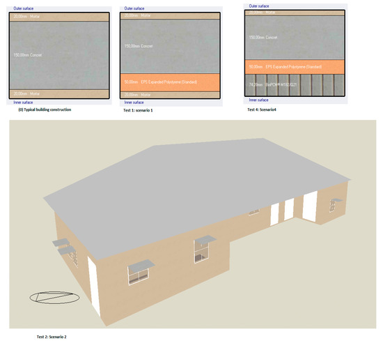 Scenario 1: The structure of the walls and the roof were changed by adding a 5 cm layer of expanded polystyrene.