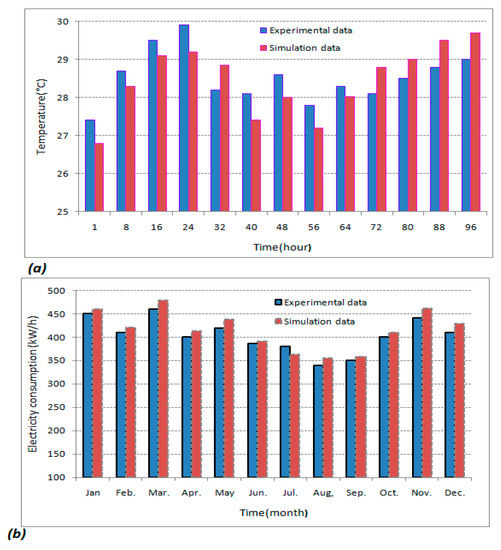 The different equations used as a basis for error calculations are mentioned in the ASHRAE guide. In this study, hourly temperature and monthly electricity data were used as a sample obtaining an MBE value of 8% and an RMSE value of 5%, where, once compared to the values suggested in the ASHRAE14 directive [28] of ±10% (case of MBE) and ±30% (case of RMSE), it can be concluded that our simulation is within the range recommended by ASHRAE. In this case, the model used in this research is considered to be validated on the basis of hourly temperature data. Experimental data were collected in 2019.