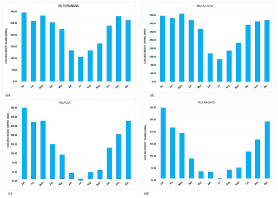 Figure 6 shows the cooling energy saving after introducing the PCM material in the case of four cities. Globally, when we apply between 3 and 7 cm of the thickness of a PCM on the walls of an office building in coastal regions, the cooling energy saving is between 10% and 30%, depending on the region. Indeed, the cooling energy saved is estimated to be about 12.2% in Antsiranana, 12.5% in Mahajunga, 11.8% in Toamasina, and 11.9% in Taolagnaro during dry and rainy seasons. These results show that PCM materials have a more significant effect regarding cooling energy saving in warm tropical climates (e.g., Mahajunga city) than other coastal climate regions.